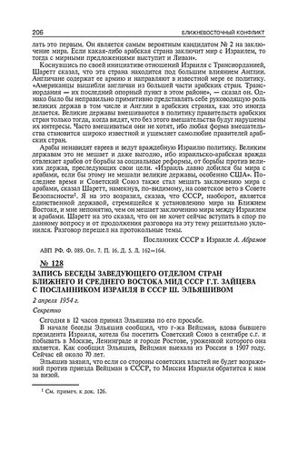 Запись беседы заведующего отделом стран Ближнего и Среднего Востока МИД СССР Г.Т. Зайцева с посланником Израиля в СССР Ш. Эльяшивом. 2 апреля 1954 г.