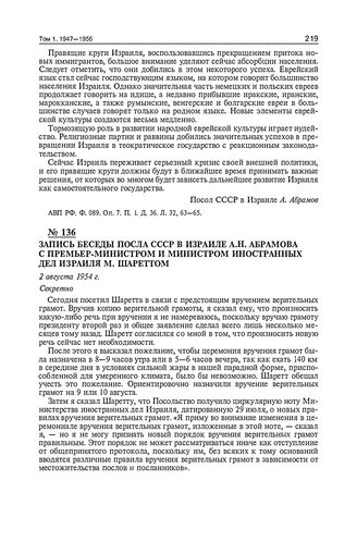Запись беседы посла СССР в Израиле А.Н. Абрамова с премьер-министром и министром иностранных дел Израиля М. Шареттом. 2 августа 1954 г. // АВП РФ. Ф. 089. Оп. 7. П. 16. Д. 6. Л. 108-112.