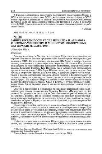 Запись беседы посла СССР в Израиле А.Н. Абрамова с премьер-министром и министром иностранных дел Израиля М. Шареттом. 14 декабря 1954 г. // АВП РФ. Ф. 089. Оп. 7. П. 16. Д. 6. Л. 265-267.