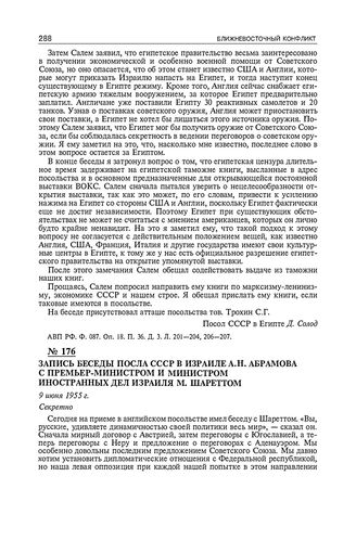 Запись беседы посла СССР в Израиле А.Н. Абрамова с премьер-министром и министром иностранных дел Израиля М. Шареттом. 9 июня 1955 г. // АВП РФ. Ф. 089. Оп. 8. П. 19. Д. 3. Л. 225-226.