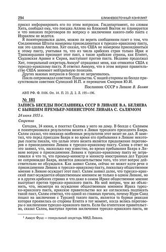 Запись беседы посланника СССР в Ливане В.А. Беляева с бывшим премьер-министром Ливана С. Салямом. 24 июня 1955 г.