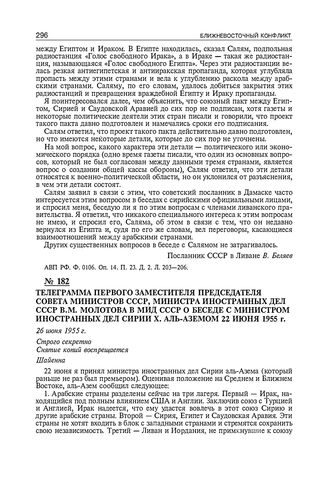 Телеграмма первого заместителя председателя Совета Министров СССР, министра иностранных дел СССР В.М. Молотова в МИД СССР о беседе с министром иностранных дел Сирии X. аль-Аземом 22 июня 1955 г. 26 июня 1955 г.