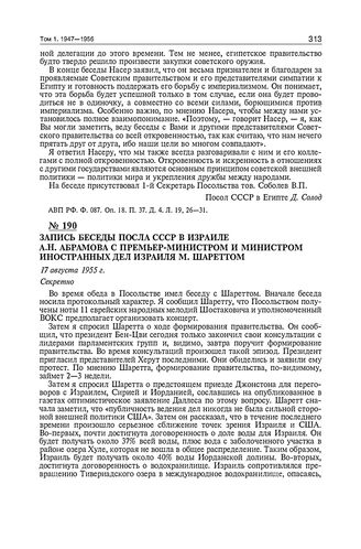 Запись беседы посла СССР в Израиле А.Н. Абрамова с премьер-министром и министром иностранных дел Израиля М. Шареттом. 17 августа 1955 г.