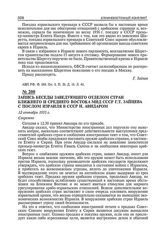 Запись беседы заведующего отделом стран Ближнего и Среднего Востока МИД СССР Г.Т. Зайцева с послом Израиля в СССР И. Авидаром. 12 сентября 1955 г.