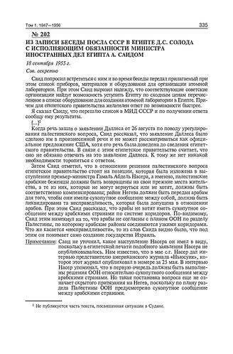 Из записи беседы посла СССР в Египте Д.С. Солода с исполняющим обязанности министра иностранных дел Египта А. Саидом. 18 сентября 1955 г. // АВП РФ. Ф. 087. Оп. 18. П. 37. Д. 4. Л. 104, 107-108 /5/.