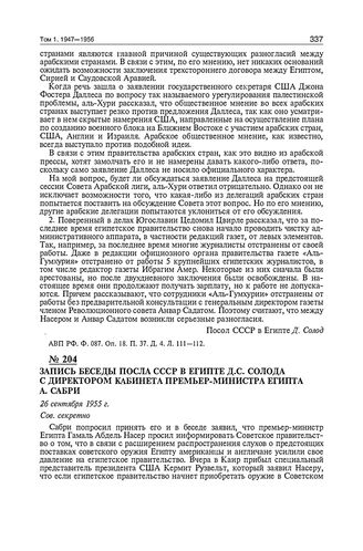 Запись беседы посла СССР в Египте Д.С. Солода с директором кабинета премьер-министра Египта А. Сабри. 26 сентября 1955 г. // АВП РФ. Ф. 087. Оп. 18. П. 37. Д. 4. Л. 117-121.