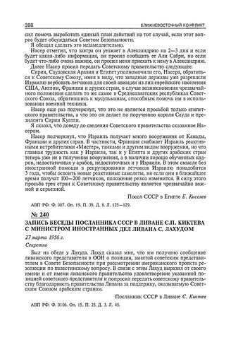 Запись беседы посланника СССР в Ливане С.П. Киктева с министром иностранных дел Ливана С. Лахудом. 27 марта 1956 г.