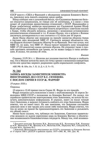 Запись беседы заместителя министра иностранных дел СССР В.С. Семенова с послом Сирии в СССР Ж. Фаррой. 19 апреля 1956 г. // АВП РФ. Ф. 0128. Оп. 19. П. 24. Д. 2. Л. 8-12.