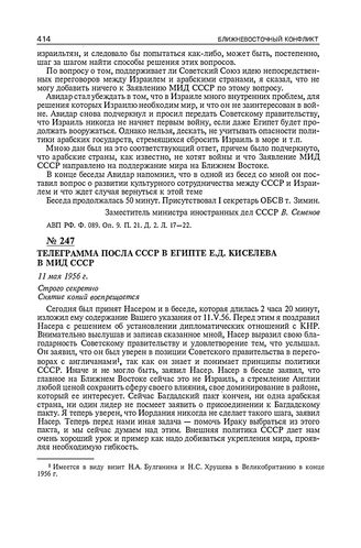 Телеграмма посла СССР в Египте Е.Д. Киселева в МИД СССР. 11 мая 1956 г. // АВП РФ. Ф. 059а. Оп. 7. П. 13. Д. 4. Л. 76-82.