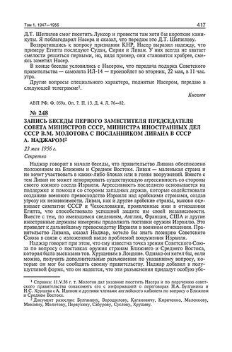 Запись беседы первого заместителя председателя Совета Министров СССР, министра иностранных дел СССР В.М. Молотова с посланником Ливана в СССР А. Наджаром. 23 мая 1956 г.