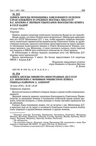 Запись беседы помощника заведующего отделом стран Ближнего и Среднего Востока МИД СССР В.С. Козлова с первым секретарем посольства Египта в СССР Кадри. 14 июня 1956 г. // АВП РФ. Ф. 0536. Оп. 1а. П. 18. Д. 58. Л. 1.