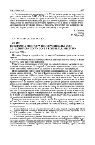Телеграмма министра иностранных дел СССР Д.Т. Шепилова послу СССР в Египте Е.Д. Киселеву. 4 августа 1956 г. // АВП РФ. Ф. 059а. Оп. 7. П. 13. Д. 4. Л. 100-102.