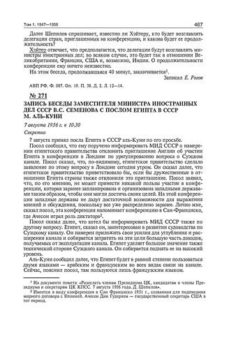 Запись беседы заместителя министра иностранных дел СССР В.С. Семенова с послом Египта в СССР М. аль-Куни. 7 августа 1956 г. // АВП РФ. Ф. 087. Оп. 19. П. 38. Д. 2. Л. 38-42.
