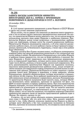 Запись беседы заместителя министра иностранных дел СССР В.А. Зорина с временным поверенным в делах Израиля в СССР А. Шлушем. 24 сентября 1956 г. // АВП РФ. Ф. 089. Оп. 9. П. 21. Д. 2. Л. 44-48.