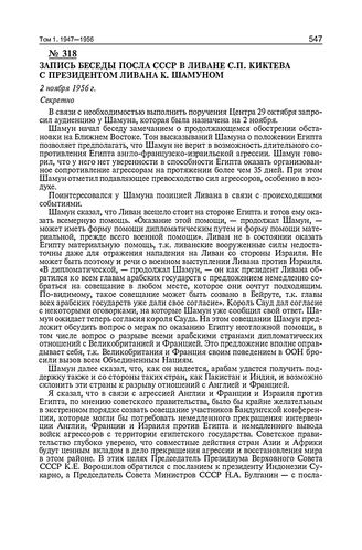 Запись беседы посла СССР в Ливане С.П. Киктева с президентом Ливана К. Шамуном. 2 ноября 1956 г. // АВП РФ. Ф. 0106. Оп. 15. П. 25. Д. 3. Л. 171-176.