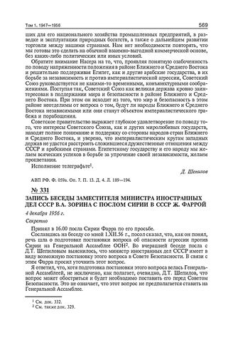 Запись беседы заместителя министра иностранных дел СССР В.А. Зорина с послом Сирии в СССР Ж. Фаррой. 4 декабря 1956 г.