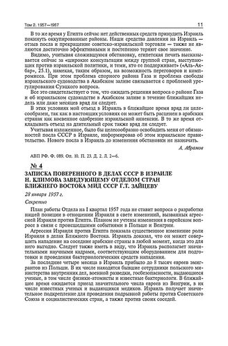 Записка поверенного в делах СССР в Израиле Н. Климова заведующему отделом стран Ближнего Востока МИД СССР Г.Т. Зайцеву. 28 января 1957 г. // АВП РФ. Ф. 084. Оп. 10. П. 23. Д. 1. Л. 2-3.