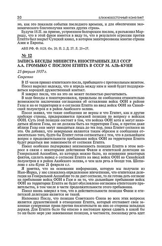 Запись беседы министра иностранных дел СССР А.А. Громыко с послом Египта в СССР М. аль-Куни. 25 февраля 1957 г. // АВП РФ. Ф. 087. Оп. 20. П. 40. Д. 5. Л. 1-4.