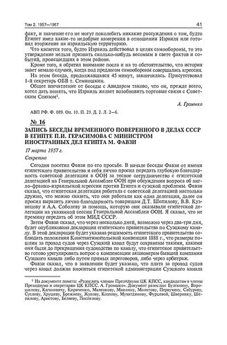 Запись беседы временного поверенного в делах СССР в Египте П.И. Герасимова с министром иностранных дел Египта М. Фавзи. 17 марта 1957 г.