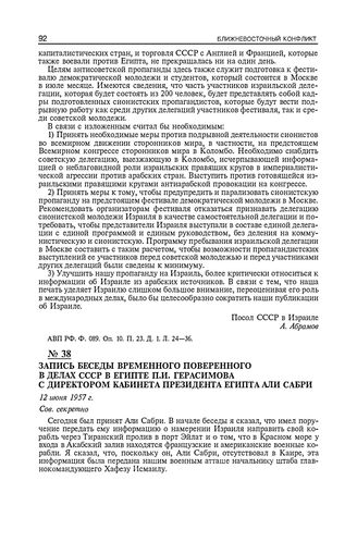 Запись беседы временного поверенного в делах СССР в Египте П.И. Герасимова с директором кабинета президента Египта Али Сабри. 12 июня 1957 г.