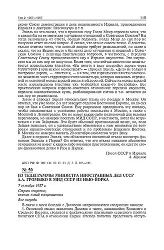 Из телеграммы министра иностранных дел СССР А.А. Громыко в МИД СССР из Нью-Йорка. 7 октября 1957 г.
