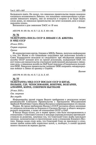 Телеграмма МИД СССР послам СССР в Китае, Польше, ГДР, Чехословакии, Венгрии, Болгарии, Албании, Корее, Северном Вьетнаме. 24 мая 1958 г. // АВП РФ. Ф. 059. Оп. 40. П. 93. Д. 456. Л. 116-122.
