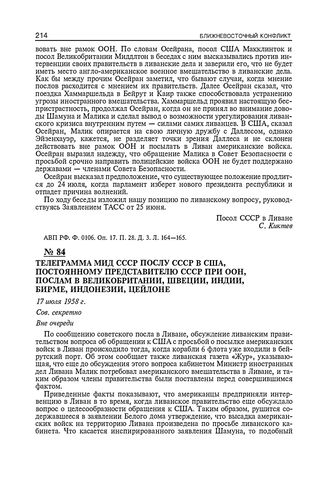 Телеграмма МИД СССР послу СССР в США, постоянному представителю СССР при ООН, послам в Великобритании, Швеции, Индии, Бирме, Индонезии, Цейлоне. 17 июля 1958 г.