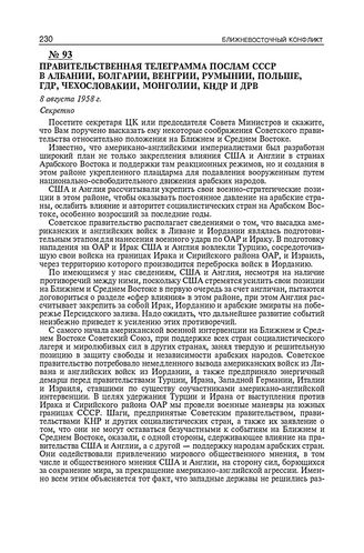 Правительственная телеграмма послам СССР в Албании, Болгарии, Венгрии, Румынии, Польше, ГДР, Чехословакии, Монголии, КНДР и ДРВ. 8 августа 1958 г. // АВП РФ. Ф. 059. Оп. 40. П. 94. Д. 460. Л. 113-118.