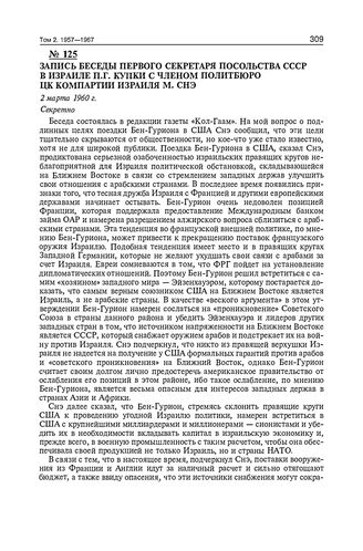 Запись беседы первого секретаря посольства СССР в Израиле П.Г. Купки с членом Политбюро ЦК компартии Израиля М. Снэ. 2 марта 1960 г. // АВП РФ. Ф. 089. Оп. 13. П. 28. Д. 4. Л. 11-13.