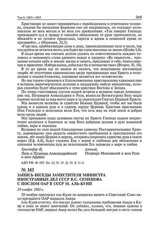 Запись беседы заместителя министра иностранных дел СССР В.С. Семенова с послом ОАР в СССР М. аль-Куни. 29 ноября 1960 г. // АВП РФ. Ф. 087. Оп. 21. П. 32. Д. 4. Л. 17-18.