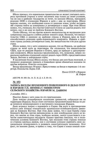 Запись беседы временного поверенного в делах СССР в Израиле Г.П. Зимина с министром сельского хозяйства Израиля М. Даяном. 2 октября 1961 г. // АВП РФ. Ф. 089. Оп. 14. П. 18. Д. 4. Л. 153-157.