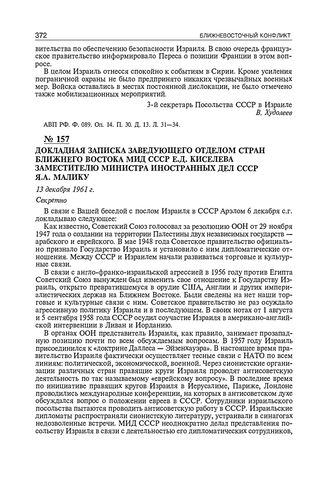 Докладная записка заведующего отделом стран Ближнего Востока МИД СССР Е.Д. Киселева заместителю министра иностранных дел СССР Я.А. Малику. 13 декабря 1961 г. // АВП РФ. Ф. 089. Оп. 14. П. 30. Д. 4. Л. 7-10.