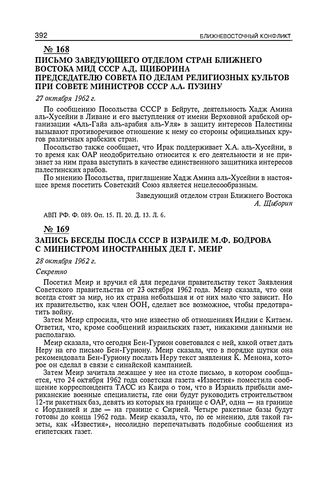 Запись беседы посла СССР в Израиле М.Ф. Бодрова с министром иностранных дел Г. Меир. 28 октября 1962 г.