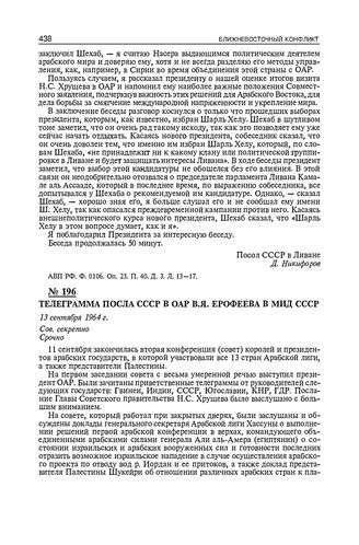 Телеграмма посла СССР в ОАР В.Я. Ерофеева в МИД СССР. 13 сентября 1964 г. // АВП РФ. Ф. 059. Оп. 50. П. 49. Д. 204. Л. 188-195.