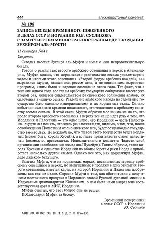 Запись беседы временного поверенного в делах СССР в Иордании Ю.В. Сусликова с заместителем министра иностранных дел Иордании Зухейром аль-Муфти. 15 сентября 1964 г. // АВП РФ. Ф. 092. Оп. 18. П. 6. Д. 2. Л. 129-130.
