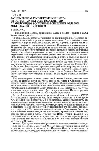 Запись беседы заместителя министра иностранных дел СССР В.С. Семенова с заведующим Восточноевропейским отделом МИД Израиля Э. Дороном. 1 июня 1965 г. // АВП РФ. Ф. 089. Оп. 18. П. 26. Д. 3. Л. 3-7.
