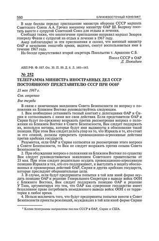 Телеграмма министра иностранных дел СССР постоянному представителю СССР при ООН. 21 мая 1967 г. // АВП РФ. Ф. 059. Оп. 56. П. 116. Д. 519. Л. 11-13.