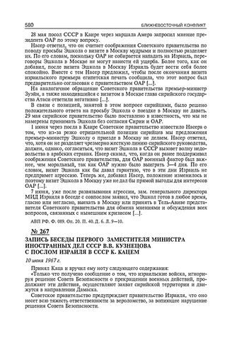 Запись беседы первого заместителя министра иностранных дел СССР В.В. Кузнецова с послом Израиля в СССР К. Кацем. 10 июня 1967 г. // АВП РФ. Ф. 089. Оп. 20. П. 32. Д. 2. Л. 7.