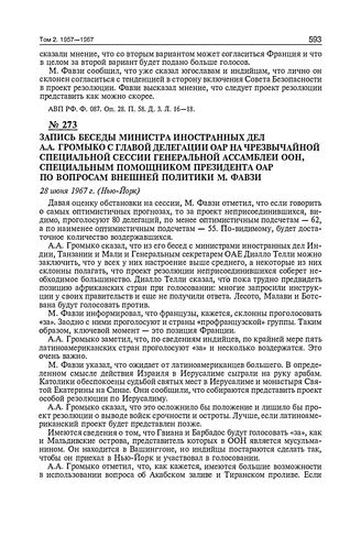 Запись беседы министра иностранных дел СССР А.А. Громыко с главой делегации ОАР на чрезвычайной специальной сессии Генеральной Ассамблеи ООН, специальным помощником президента ОАР по вопросам внешней политики М. Фавзи. Нью-Йорк. 28 июня 1967 г. // АВП РФ. Ф. 087. Оп. 28. П. 58. Д. 3. Л. 19-21.