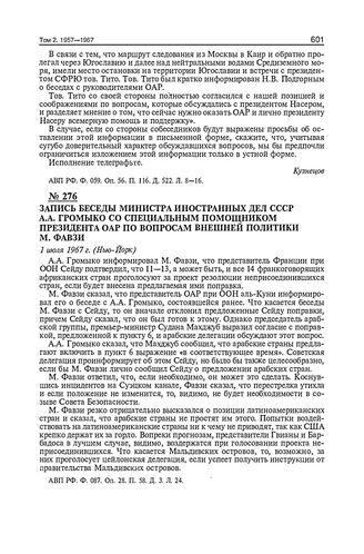 Запись беседы министра иностранных дел СССР А.А. Громыко со специальным помощником президента ОАР по вопросам внешней политики М. Фавзи. Нью-Йорк. 1 июля 1967 г. // АВП РФ. Ф. 087. Оп. 28. П. 58. Д. 3. Л. 24.