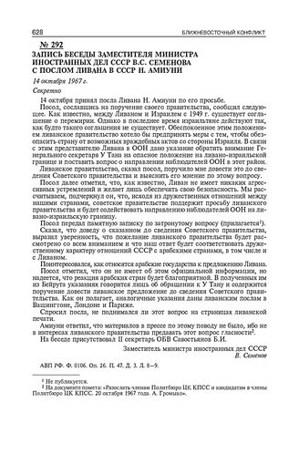 Запись беседы заместителя министра иностранных дел СССР В.С. Семенова с послом Ливана в СССР Н. Амиуни. 14 октября 1967 г.
