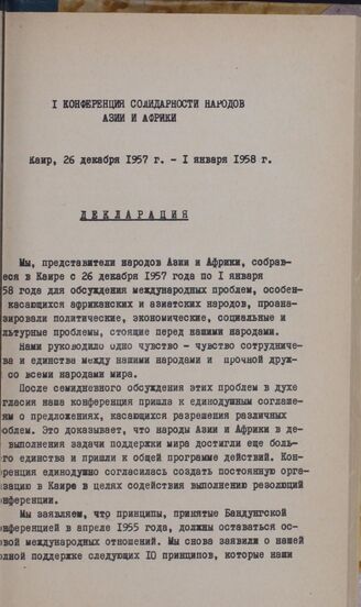 I Конференция солидарности народов Азии и Африки. Каир, 26 декабря 1937 г.-1 января 1938 г. Декларация