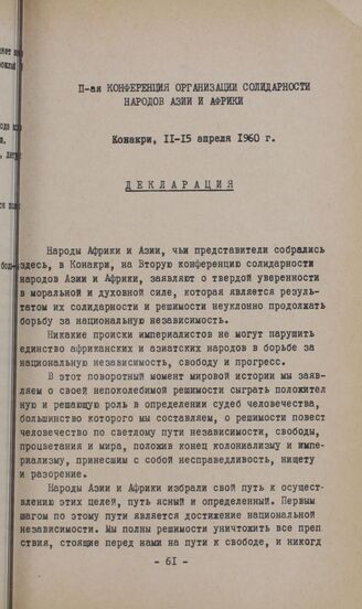II-ая конференция Организации солидарности народов Азии и Африки. Конакри, 11-15 апреля 1960 г. Декларация