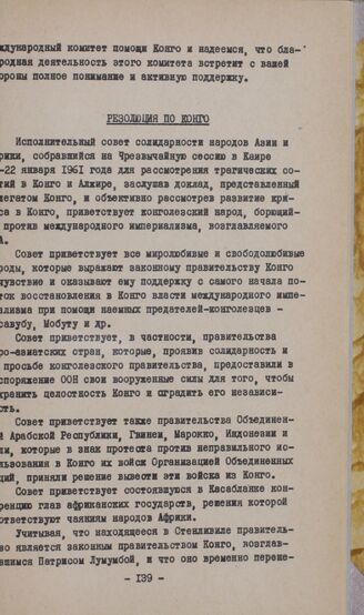 Чрезвычайная сессия Совета солидарности народов Азии и Африки. Каир, 21-22 января 1961 г. Резолюция по Конго