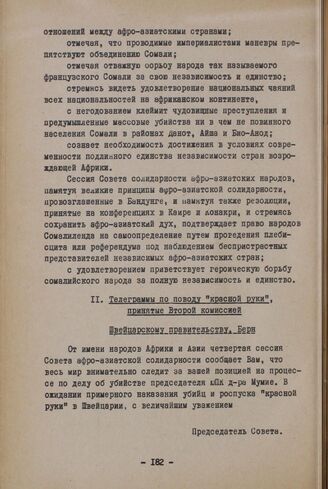 Сессия Совета Организации солидарности народов Азии и Африки. Бандунг, 10-15 апреля 1961 г. Вторая комиссия. 11. Телеграммы по поводу "красной руки", принятые Второй комиссией. Швейцарскому правительству, Берн
