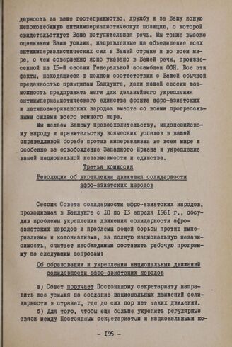 Сессия Совета Организации солидарности народов Азии и Африки. Бандунг, 10-15 апреля 1961 г. Третья комиссия. Резолюции об укреплении движения солидарности афро-азиатских народов. Об образовании и укреплении национальных движений солидарности афро-азиатских народов