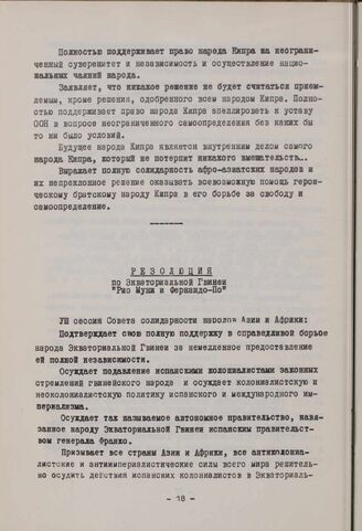VIII сессия Совета Организации солидарности народов Азии и Африки. 13-17 февраля 1967 года. Никозия, Кипр. Резолюция по Экваториальной Гвинеи "Рио Муни и Фернандо-По"