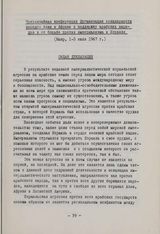 Чрезвычайная конференция Организации солидарности народов Азии и Африки в поддержку арабских народов в их борьбе против империализма и Израиля (Каир, 1-3 июля 1967 г.) Общая декларация