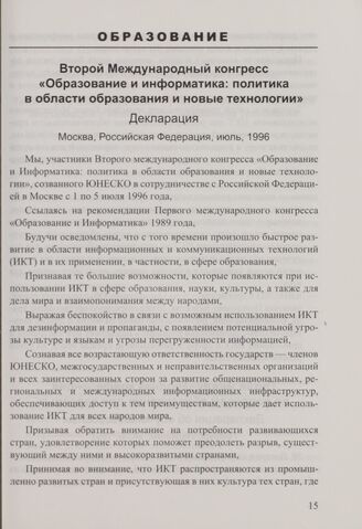 Второй Международный конгресс «Образование и информатика: политика в области образования и новые технологии». Декларация. Москва, Российская Федерация, июль, 1996