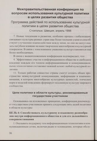 Межправительственная конференция по вопросам использования культурной политики в целях развития общества. Программа действий по использованию культурной политики в целях развития общества. Стокгольм, Швеция, апрель 1998